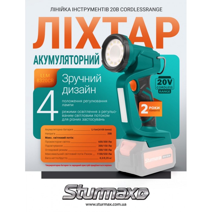 Sturmax LLM8320CR – универсальный 20В аккумуляторный фонарь линейки инструментов под единственную аккумуляторную платформу Sturmax Cordless Range . Благодаря умеренным габаритам, небольшой массе и широкому функционалу модель может использоваться в разных направлениях деятельности – одинаково удобно как при домашнем использовании, так и в сферах сервиса и ремонта, строительства, туризма и т.п. – везде, где есть потребность в дополнительном качественном освещении. Устройство оснащено двумя основными LED-источниками света (LED-элемент направленного света позволяет освещать объекты на большом расстоянии, LED-элемент рассеянного света обеспечивает равномерное освещение поблизости), а также дополнительный энергосберегающий режим подсветки. В зависимости от потребностей пользователь может задействовать каждый элемент LED отдельно или использовать их вместе для максимального освещения. Главная часть фонаря поворотная, что позволяет направлять световой поток в нужном направлении. Благодаря наличию специальной зацепной скобы фонарь можно подвешивать для большего удобства работы. Устройство совместимо с аккумуляторами Sturmax CRM2002B/CRM2004B/CRM2006B/CRM2008B .