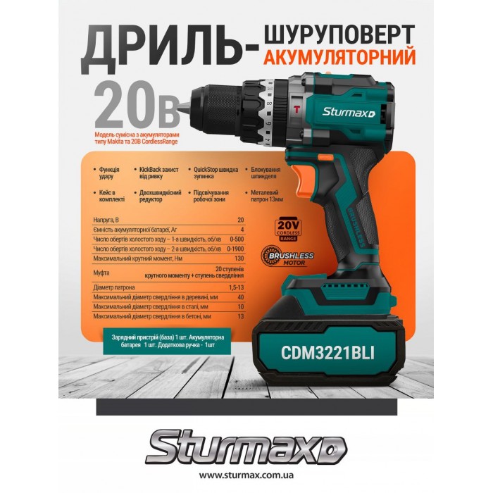 Sturmax CDM3221BLI – аккумуляторный 20В двухскоростной шуруповерт. Модель имеет компактные размеры, небольшую массу и отличную эргономику, благодаря чему максимально удобна в использовании. Одной из ключевых особенностей шуруповерта Sturmax CDM3221BLI является бесщеточный электродвигатель – он повышает стойкость к перегрузкам и обеспечивает лучшую производительность работы на одном заряде АКБ. Такой двигатель не подвержен перегреву и позволяет дольше работать без перерывов. Инструмент демонстрирует высокие, одни из лучших в своем классе, показатели крутящего момента (макс. крутящий момент – 130 Нм), что существенно расширяет сферу его применения. Наличие ударного режима обеспечивает более эффективное сверление твердых материалов, таких как легкий бетон и кирпич. Модель Sturmax CDM3221BLI имеет отличную оснастку: функцию KickbackStop, защищающую пользователя от обратного удара, надежный металлический патрон 13 мм, блокировку шпинделя, электронный тормоз двигателя, LED подсветку рабочей зоны. Для удобства пользователя предусмотрена металлическая клипса для крепления. В стандартную комплектацию шуруповерта входят аккумулятор, зарядное устройство (база), двухсторонняя рукоятка, а также пластиковый кейс для хранения и транспортировки.