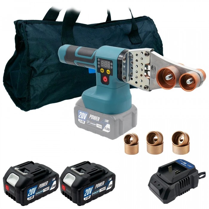 Аккумуляторный паяльник PROFI-TEC PWM20BL  — это мощный инструмент, который используется для монтажа трубопроводов из полипропилена, позволяет получить прочное соединение, исключить протечки и микротрещины. Особенности аккумуляторного паяльника PROFI-TEC PWM20BL: Равномерная и стабильная теплопроводность; Быстрый нагрев; Интеллектуальный и точный цифровой дисплей; Автоматический контроль температуры; Отражение температуры в реальном времени; Благодаря антипригарному покрытию пластик не будет налипать к сварочным насадкам; Надежный хват и удобство в использовании достигается благодаря компактным размерам и прорезиненной рукоятке; Вся линейка инструментов PROFI-TEC POWERLine совместима и работает от батарей MAKITA LXT. Комплект поставки: Аккумуляторный паяльник PROFI-TEC PWM20BL; Зарядное устройство; Аккумуляторы PT2040MP (4.0 Ач) ×2; Сварочные насадки (20 / 25 / 32 мм); Инструкция по эксплуатации; Гарантийный талон; Сумка для транспортировки и хранения.