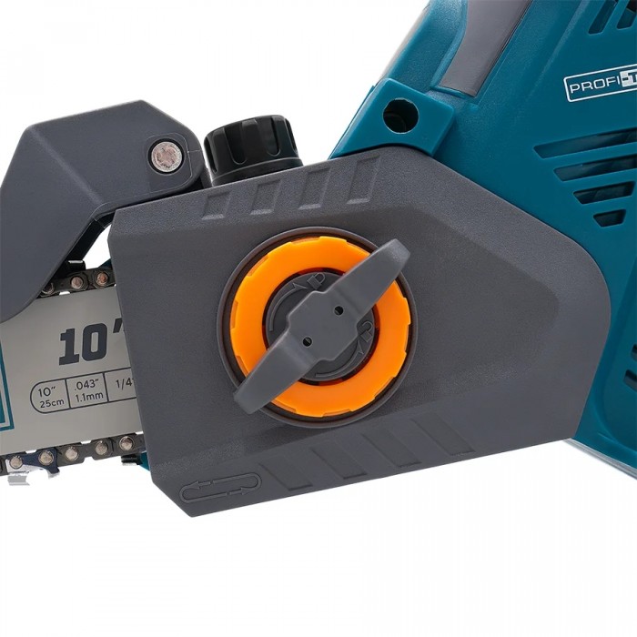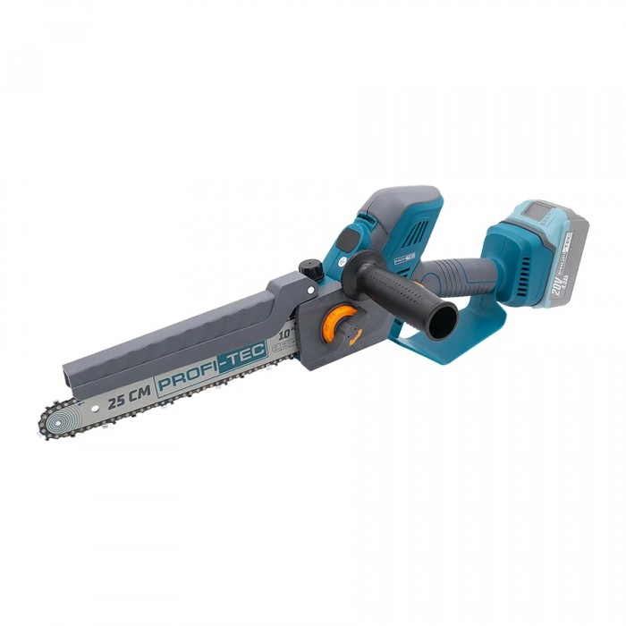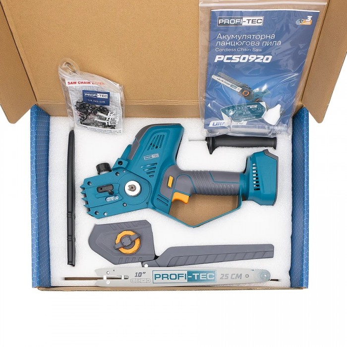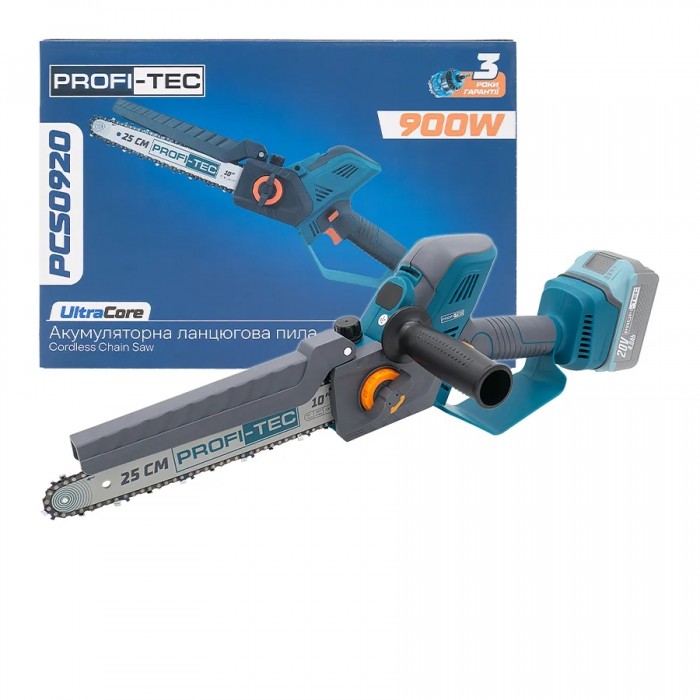 Аккумуляторная цепная пила PROFI-TEC PCS0920 – это производительный и удобный в использовании инструмент для обрезки веток, формовки крон, заготовки дров и других распылительных задач. Конструкция с бесщеточным двигателем, надежным пилочным узлом и эффективной передачей мощности обеспечивает стабильный рез и безопасную работу в любых условиях. Особенности аккумуляторной цепной пилы PROFI-TEC PCS0920: Бесщеточный двигатель мощностью 900 Вт обеспечивает высокий крутящий момент, стабильность резки и продолжительный ресурс работы. Компактная шина длиной 25 см оптимизирована для обрезки веток, раскроя древесины и выполнения монтажных задач. Скорость движения цепи 9,6 м/с обеспечивает высокую производительность резки и гарантирует чистый контролируемый пропил. Автоматическая система смазывания снижает трение, предотвращает перегревание и продлевает срок службы пильного узла. Защитная кнопка предупреждает случайный запуск, обеспечивая дополнительный уровень безопасности при хранении и транспортировке. Беcключовая регулировка натяжения цепи позволяет выполнять обслуживание быстро, точно и без дополнительных инструментов. Удлиненная фронтальная рукоятка повышает контроль резки и обеспечивает удобство работы под углом и в труднодоступных местах. Эргономичный корпус со сбалансированным центром тяжести и прорезиненной рукояткой снижает вибрацию и усталость оператора. Защитный кожух предотвращает травмирование оператора в случае обратного удара или непредсказуемого обрыва цепи. Комплект поставки: Аккумуляторная цепная пила PROFI-TEC PCS0920; Пильная цепь ×1; Пильная шина 25 см ×1; Дополнительная рукоятка; Защитный кожух цепи; Инструкция по эксплуатации; Гарантийный талон; Упаковка – картонная коробка; Без аккумулятора и зарядного устройства.