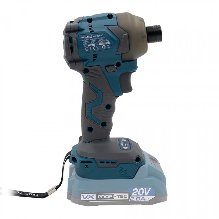 Аккумуляторный импульсный винтоверт PROFI-TEC PPID2620 – это высокопроизводительный профессиональный инструмент, предназначенный для быстрого и точного закручивания и откручивания шурупов, винтов и болтов в древесине, металле, гипсокартоне и других материалах. Идеально подходит для интенсивного использования при строительных и монтажных работах, на производстве, в автосервисах, а также для сборки мебели и выполнения других задач, требующих высокой производительности и надёжности. Особенности аккумуляторного импульсного винтоверта PROFI-TEC PPID2620: Бесщеточный двигатель обеспечивает повышенную мощность, производительность и эффективное энергопотребление даже при интенсивных нагрузках. Хвостовик диаметром 1/4″ обеспечивает совместимость с широким спектром насадок, гарантируя надежную фиксацию и стабильную передачу крутящего момента. Высокий крутящий момент 230 Нм для закручивания и 260 Нм для откручивания позволяет работать даже с прочно зафиксированными крепежами. Четыре режима регулировки оборотов и частоты ударов позволяют оптимально настраивать инструмент в зависимости от материала и выполняемых задач. Функция памяти режимов автоматически сохраняет последние настройки, что позволяет быстро возвращаться к предыдущему рабочему режиму. Режим сна автоматически отключает индикаторы и подсветку при бездействии, сохраняя заряд аккумулятора и продлевая автономную работу. Встроенная LED-подсветка улучшает видимость рабочей зоны, обеспечивая комфортную работу даже в темных или труднодоступных местах. Компактный дизайн и эргономичная рукоятка минимизируют нагрузку на кисть, повышая комфорт при длительном использовании. Металлический крючок для подвешивания позволяет надежно закрепить инструмент на поясе или снаряжении, обеспечивая удобство при работе на высоте. Индикатор уровня заряда аккумулятора, расположенный на корпусе, позволяет контролировать остаток энергии для непрерывной работы инструмента. Комплект поставки: Аккумуляторный импульсный винтоверт PROFI-TEC PPID2620; Инструкция по эксплуатации; Гарантийный талон; Пластиковый кейс; Без аккумулятора и зарядного устройства.