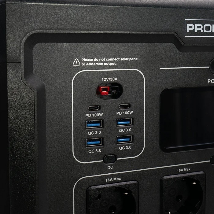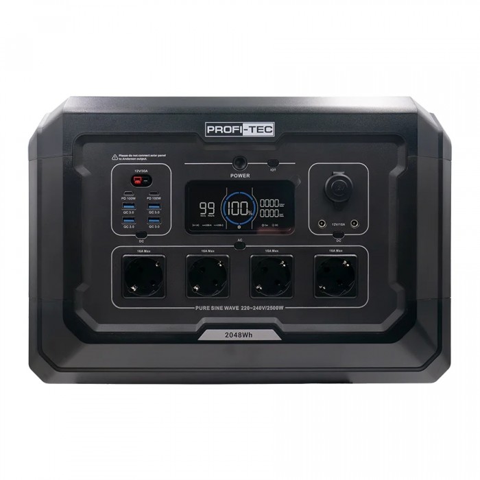 Портативная зарядная станция PROFI-TEC PPS2500 – это компактное устройство, предназначенное для автономного питания электронных и электрических устройств. Ее используют в домашних условиях, во время путешествий, кемпинга, работы на отдаленных объектах и экстренных ситуациях. Благодаря высокой производительности и надежности станция обеспечивает стабильное питание разнообразного оборудования от гаджетов до электроинструментов и бытовых устройств. Особенности портативной зарядной станции PROFI-TEC PPS2500: EPS-функция (аварийное резервное питание) обеспечивает автоматическое переключение на аккумулятор при отключении электросети. Переход происходит за 20 мс, что позволяет бесперебойно поддерживать работу бытовой техники в экстренных ситуациях; Надежный литий-железо-фосфатный аккумулятор (LiFePO₄) обеспечивает длительный срок службы, высокую надежность и повышенную безопасность, что делает его идеальным для длительного использования в различных условиях; Высокая производительность обеспечивает номинальную мощность 2500 Вт, что позволяет питать бытовые приборы, электроинструменты и другие устройства. Емкость аккумулятора 2048 Вт·ч обеспечивает длительное время автономной работы; Расширенные возможности управления предусматривают дистанционное управление через мобильное приложение (Wi-Fi и Bluetooth) и ЖК-дисплей, отображающий уровень заряда, остаточное время работы и другие важные параметры; Универсальные варианты подключения включают выходы USB-A, USB-C (до 100 Вт), розетки переменного и постоянного тока. Зарядка возможна от автомобиля, солнечных панелей (MPPT до 2100 Вт) и бензинового генератора; Защита и безопасность обеспечиваются интеллектуальной системой защиты от короткого замыкания, перегрузки, перегрева и перенапряжения. Дополнительная защита от перегрузки переменного тока гарантируется встроенным реле; Возможность подключения к 6 стандартным солнечным панелям и 15 внешним аккумуляторам позволяет значительно увеличить время автономной работы устройства, делая его идеальным для длительного использования в любых условиях; Поддержка быстрой зарядки через переменный ток (до 1600 Вт) позволяет полностью зарядить станцию за 1,5 часа, что обеспечивает удобство использования без длительных перерывов; Возможность выбора между быстрой (H) и медленной (L) зарядкой позволяет оптимизировать энергопотребление в зависимости от потребностей, что способствует более эффективному использованию ресурсов. Комплект поставки: Портативная зарядная станция PROFI-TEC PPS2500; Автомобильный зарядный кабель Anderson; Кабель Anderson; Кабель Anderson-7909; Кабель Anderson-MC4; Кабель для зарядки переменным током; Инструкция по эксплуатации; Гарантийный талон; Упаковка – картонная коробка.